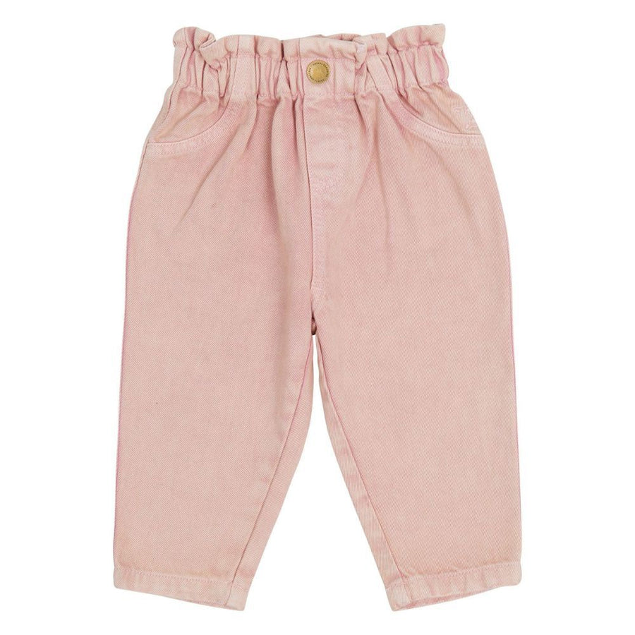 The cutest baby pant in soft pink with gathered garter elastic waist, button fly and closure.