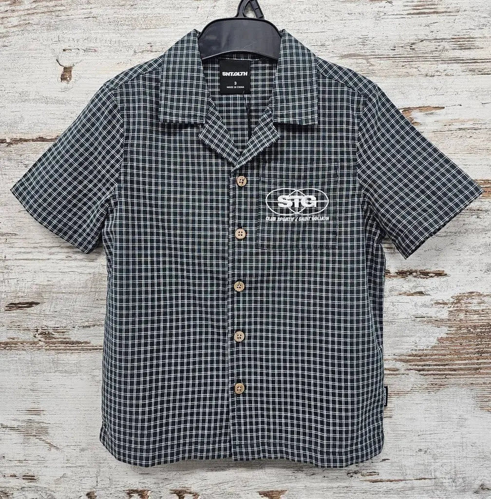Make a statement in the St Goliath Check Shirt in a stunning bottle green base fabric with white check pattern throughout. Featuring a classic collar, straight-cut hem, and five-button front, this short-sleeve shirt is finished with a contrast embroidered graphic in white cotton on the front pocket. Effortlessly cool, perfectly cut, and ready to turn heads.