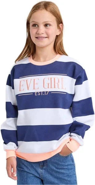 The Eve Girl Stripe Crew is a Cotton and Polyester blend brushed fleece in a slightly oversized shape, with a softening wash for soft handfeel. The crew features an all over printed stripe with a contrast front chest embroidery, and a branded badge over the side seam. The neck, cuffs and hem are all finished with a 2x2 rib for stretch and comfort