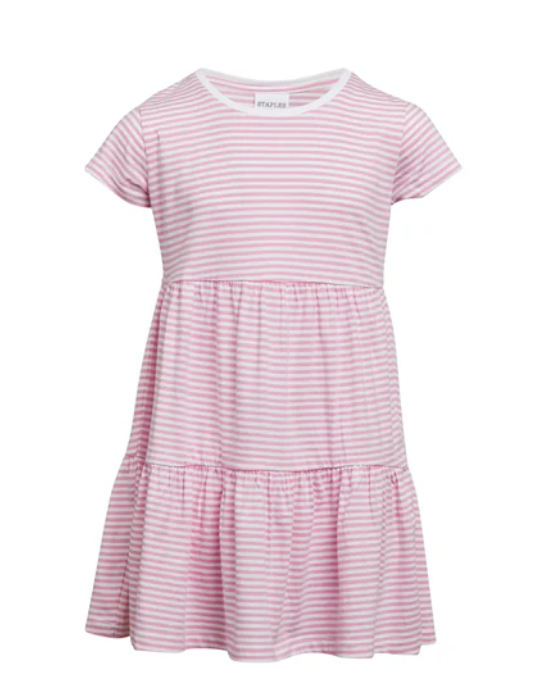 The Stripe Beach Dress is made from 100% cotton jersey in an all over yarn dyed stripe and features an all over garment wash for soft hand feel. The dress features a drop waist with gathered tiers down the skirt. The dress has a self-fabric neck band with the sleeves and hem turned up and finished with twin needle stitching.