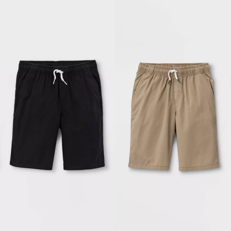 The Pull-On Woven Shorts from Cat & Jack™ make a timeless staple in his casualwear closet. Fashioned in light khaki and gray hues, he can pair these khaki and gray pull-on shorts with his favorite tees and sneakers for a warmer look, and add a hoodie when the temperature starts to dip. Crafted from super-soft cotton with an elastic waistband and front drawstring, this pack of mid-rise shorts keeps him comfy from day to night, and their classic at-knee length allows for easy mobility throughout the day..