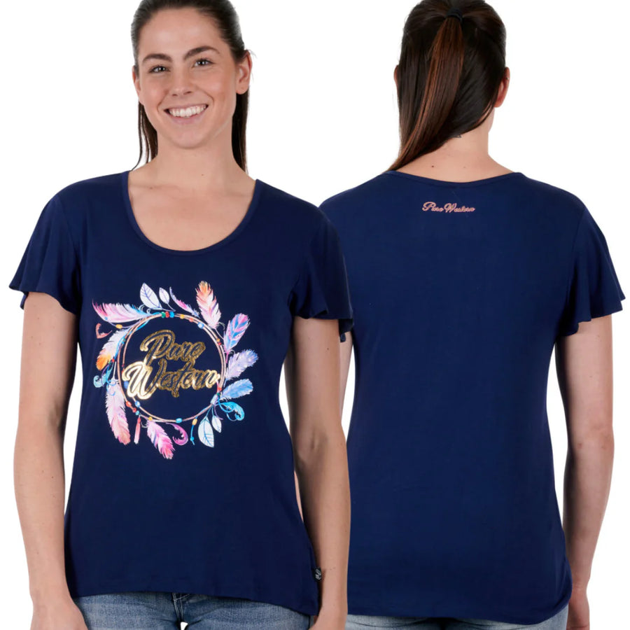 Features: Fashion tee with flutter sleeves, large front feature print with metallic detail, self fabric neck bind, Pure Western logo pip on side seam