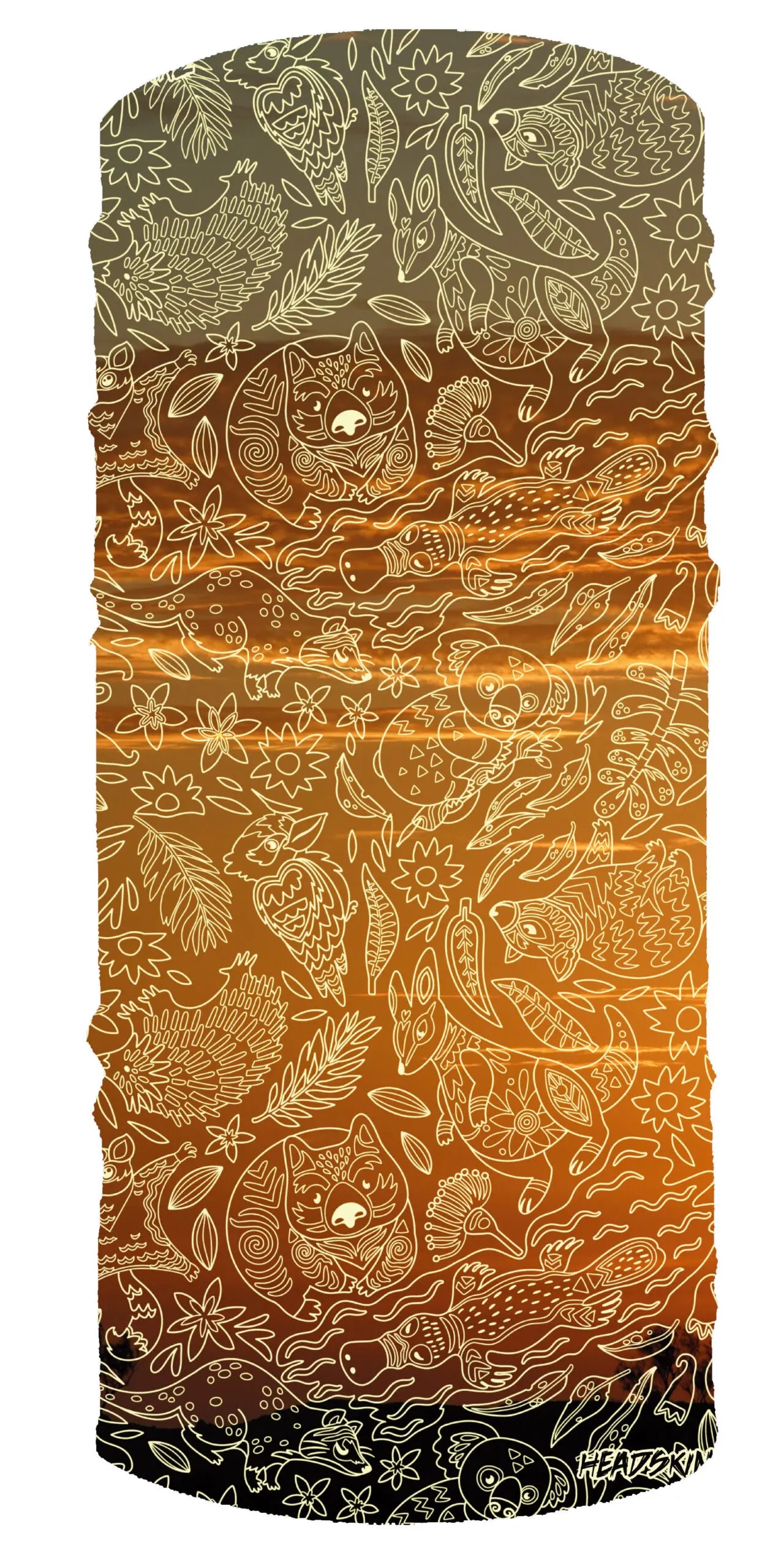 The Headskinz Aussie Natives (Earthy) Face Shield showcases a stunning design inspired by the Australian Outback at dusk, featuring creamy gold highlights that bring native Australian animals and plants to life. Crafted from soft, moisture-wicking polyester microfiber, it offers over 95% UV protection and can be worn in more than 12 ways, making it versatile for various outdoor activities. This unisex, one-size-fits-most accessory provides comfort and style while shielding you from sun, wind, dust, and cold.